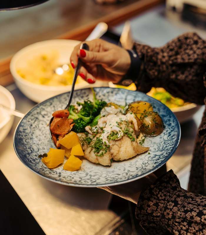 Från kl. 11.00 till 13.15 serveras vår lunchbuffé – lagad från grunden med säsongens råvaror. Här finns alltid genomtänkta vegetariska alternativ, tillsammans med fisk eller kötträtter. Det hembakade brödet, som blivit lite av en favorit bland våra gäster, ingår givetvis i lunchbuffén.